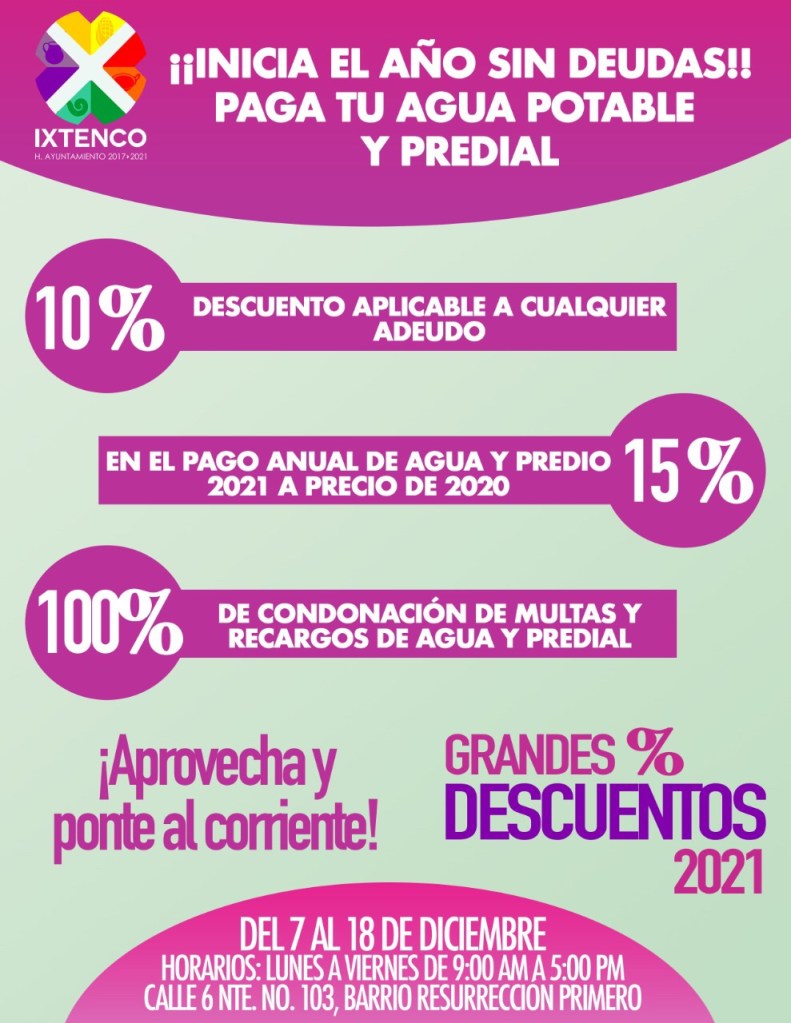 El Gobierno Municipal de Ixtenco, que encabeza Miguel Ángel Caballero Yonca, anunció a través del área de tesorería que del 7 a 18 de diciembre arrancará la campaña decembrina de descuentos en el pago del impuesto predial y el servicio de agua potable.