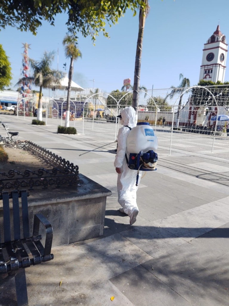 Durante estos días, las familias acostumbran a salir a realizar comprar por el fin de año, motivo por el cual el cuerpo de Protección Civil del gobierno municipal se ha dado a la tarea de desinfectar la Clínica #5 del IMSS, el Centro de Salud, la iglesia de Santo Toribio, la explanada municipal, así como banquetas y jardineras donde generalmente se concentran algunos pobladores.