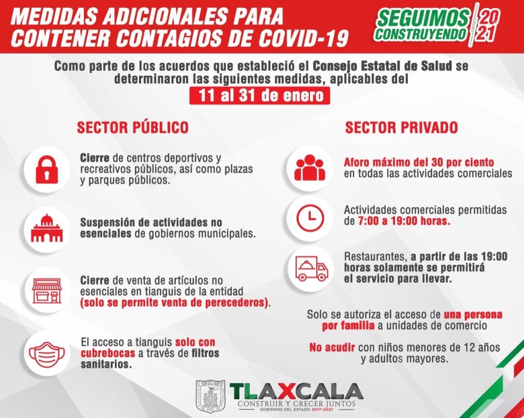 El Gobierno del Estado informa que a partir de este 11 de enero y hasta el 31 del mismo mes, el Consejo Estatal de Salud determinó para el sector público, el cierre de centros deportivos y recreativos públicos, así como plazas y parques públicos; cierre de venta de artículos no esenciales en tianguis de la entidad (solo se permite venta de perecederos).