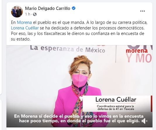 A través de sus redes sociales, el presidente nacional de Morena, Mario Delgado Carrillo, refrendó su respaldo a Lorena Cuéllar Cisneros como ganadora de la encuesta para ser elegida como Coordinadora Estatal para la Defensa de la 4T en Tlaxcala.