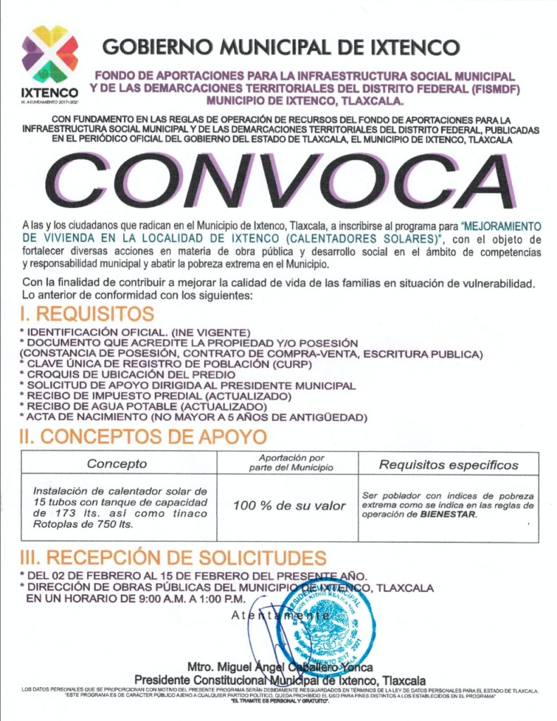 Este día, a través de su portal de internet, el Ayuntamiento de Ixtenco, público la convocatoria, en donde invitan a la población otomí, a inscribirse al Programa de Calentadores Sociales.