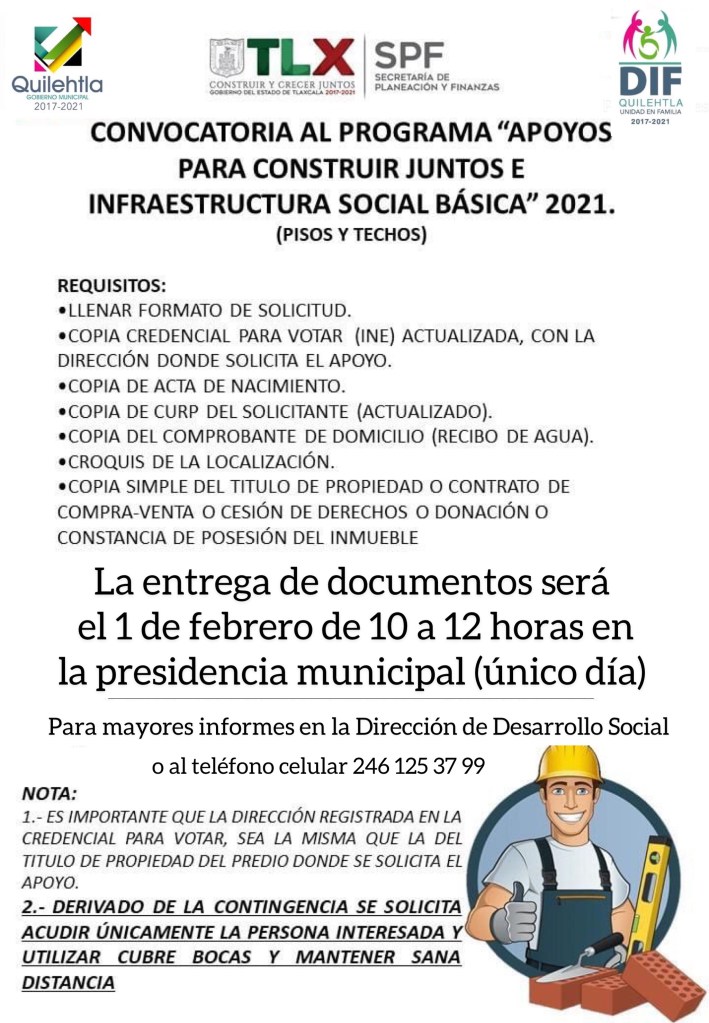 Para mayores informes, los interesados deberán acudir a la Dirección de Desarrollo Social de Santa Cruz Quilehtla, ubicada en la presidencia municipal.