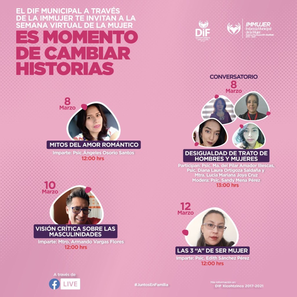 El sistema DIF Municipal de Xicohtzinco presidido por la Lic. en psicología Isabel del Pilar Badillo Tzontecomani y el Instituto Municipal de la Mujer hacen pública la invitación a ser partícipe de la “Semana Virtual de la Mujer: Es Momento de Cambiar Historias” evento que debido a las restricciones sanitarias a causa de la pandemia por la COVID-19 se llevará a cabo a través de transmisiones en vivo en su página oficial de Facebook.