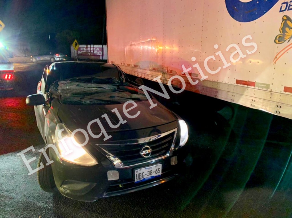 El conductor de un vehículo Nissan Versa resultó ileso tras incrustarse contra la caja de un tráiler cuando circulaba sobre la Vía Corta a la altura de la comunidad de Ayometitla.