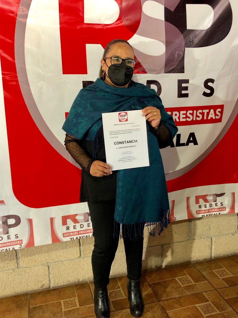 De manos de los lideres de Redes Sociales Progresistas (RSP), Juana Moreno Morales, recibió su constancia de registro como virtual candidata a diputada por el distrito XIII.