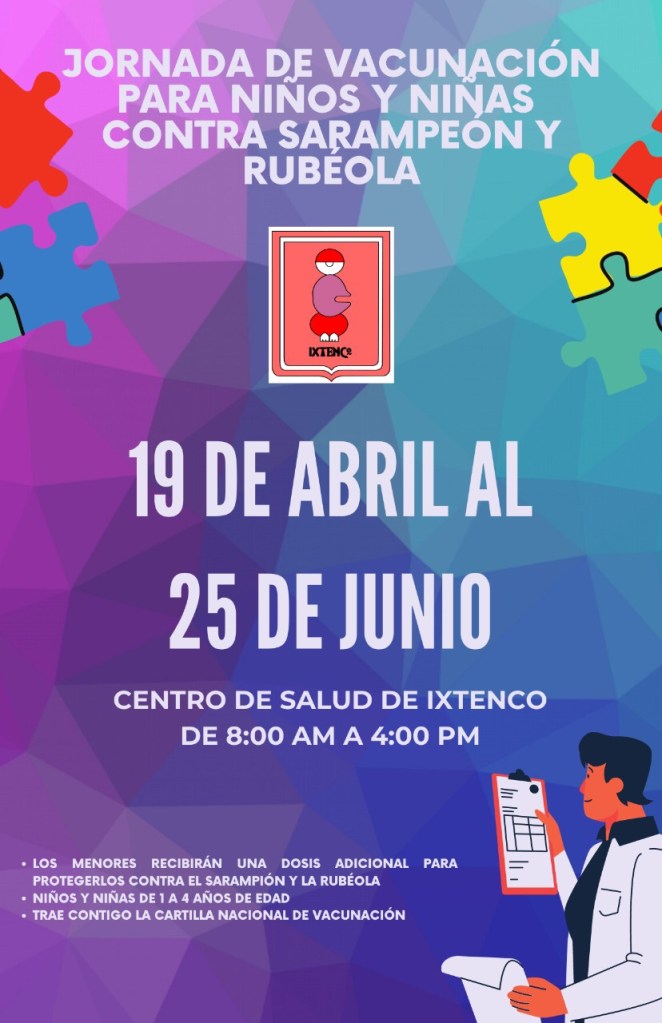 Los padres con sus menores hijos podrán acudir, desde este día y hasta el 25 de junio, en un horario de 8:00 a 16 horas, en el centro de salud de Ixtenco y deberán presentar su cartilla nacional de vacunación.