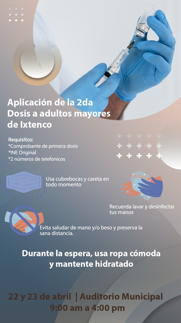 El día de mañana, iniciará en Ixtenco la segunda etapa de la aplicación de la vacuna para los adultos mayores de esa demarcación, la vacuna será aplicada los días 22 y 23 de abril.
