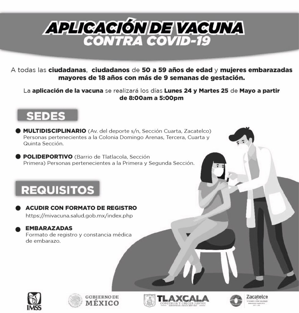La Secretaría del Bienestar informó que en Zacatelco, la Estrategia Nacional de Vacunación de Covid-19 en personas de 50 a 59 años de edad se llevará a cabo los días 24 y 25 de mayo de 08:00 a 17:00 horas.