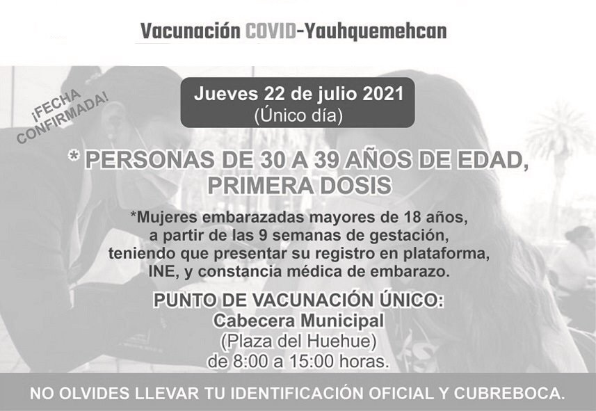 El Ayuntamiento de Yauhquemehcan, informa a la población que el jueves 22 de julio (único día), se estará aplicando la primera dosis de la vacuna contra Covid-19 a personas de 30 a 39 años de edad.
