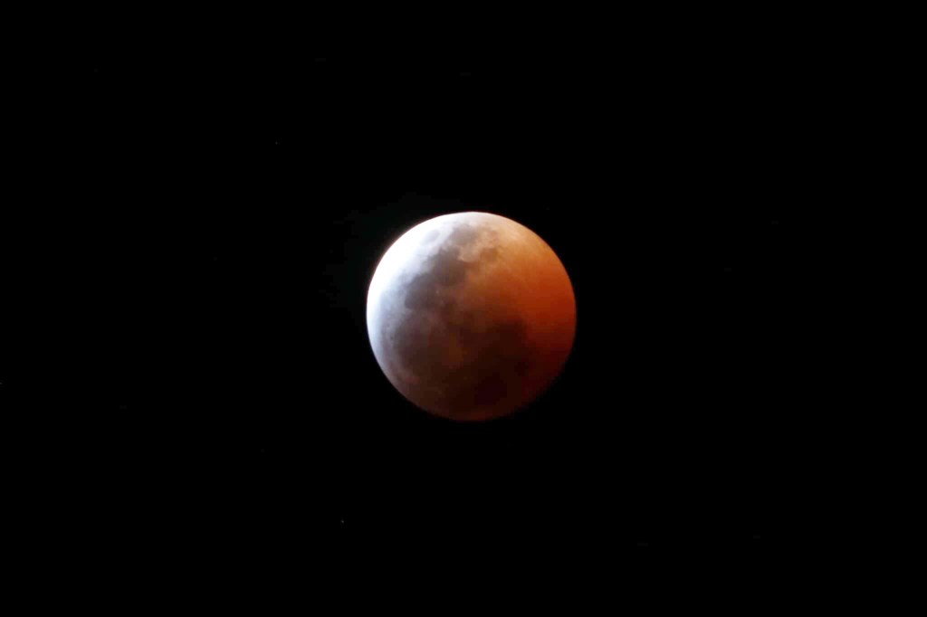 La lente del periodista grafico plasmó el momento justo en que la sombra de la tierra cubría la luna hasta alcanzar un tono rojizo.