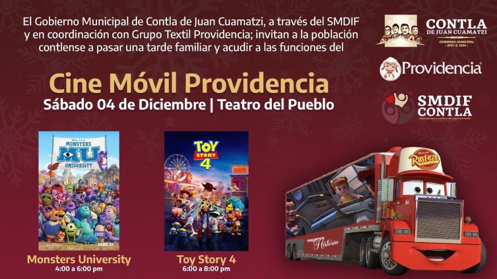 Esta actividad se realizará mañana, sábado 4 de Diciembre con dos funciones a las 4 y 6 de la tarde donde se proyectarán las películas de “Monsters University” y “Toy Story 4” respectivamente. Donde el Gobierno Municipal dará las facilidades para la llegada del trailer “McQueen”, y brindará palomitas gratis para todos los menores; ademá de que se supervisará que niños y adultos, cumplan con el uso obligatorio de cubrebocas, así como las demás medidas preventivas que se establecieron ante la contingencia.