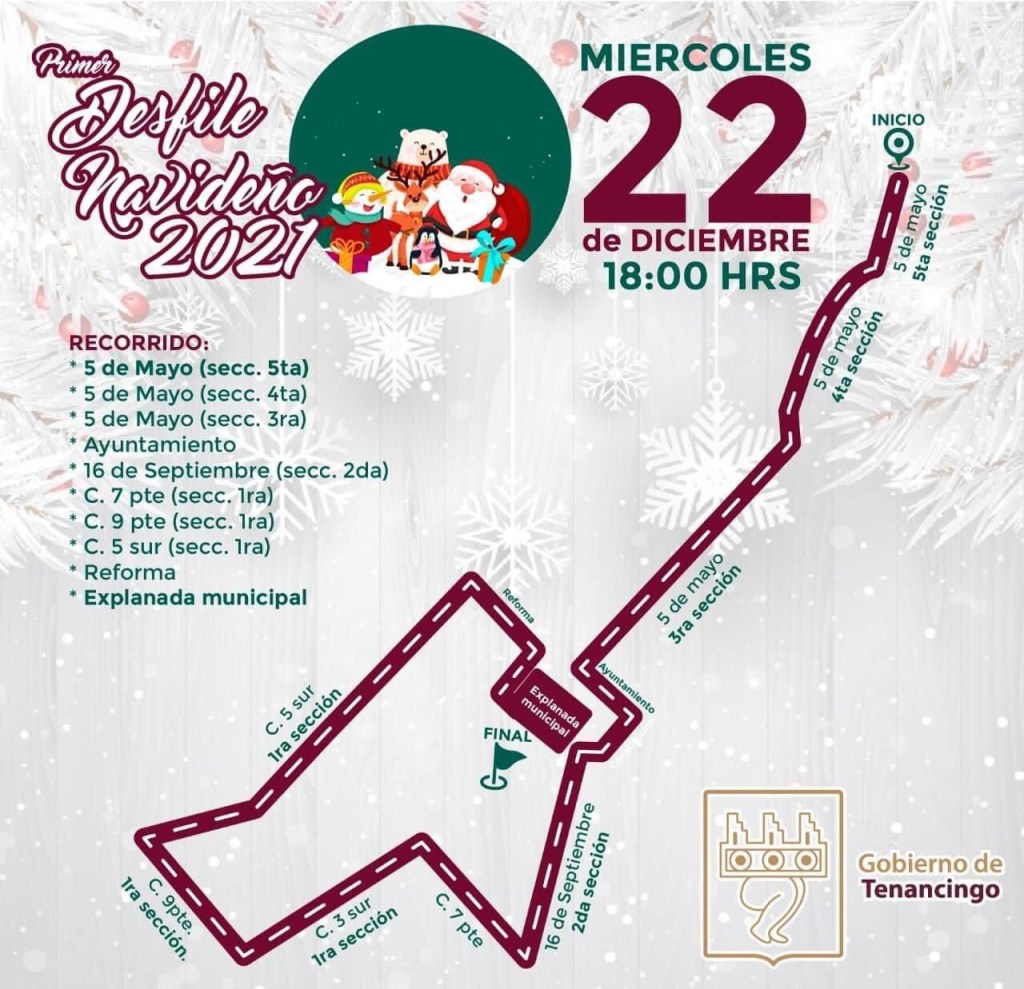 La primera presidenta municipal de Tenancingo, indicó que el desfile dará inicio en punto de las 18:00 horas de este miércoles 22 de diciembre, arrancando en la calle 5 de Mayo de la quinta sección de esa demarcación.