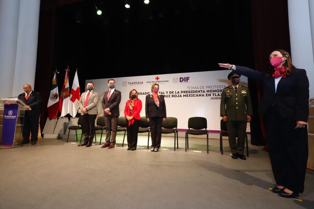 En el Teatro Xicohténcatl, la mandataria estatal felicitó a Silvia Elena Rodríguez de Espino por su gran desempeño durante los cinco años que estuvo al frente de la delegación Cruz Roja y reconoció la loable labor de esta institución al servicio de la ciudadanía durante 112 años, “siempre están presentes para prestar auxilio o socorro a quien lo necesita, es mucho lo que debemos de reconocerles”.