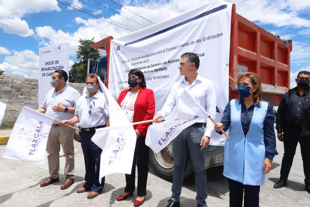 La gobernadora Lorena Cuéllar Cisneros dio el banderazo de inicio a obras de rehabilitación carretera en la comunidad de Santa Cruz Techachalco, municipio de Panotla y en la zona intermunicipal de Tetlatlahuca y Zacatelco, que tendrán una inversión total de 23 millones 059 mil 114 pesos provenientes del Fondo de Aportaciones para el Fortalecimiento de las Entidades Federativas 2022.