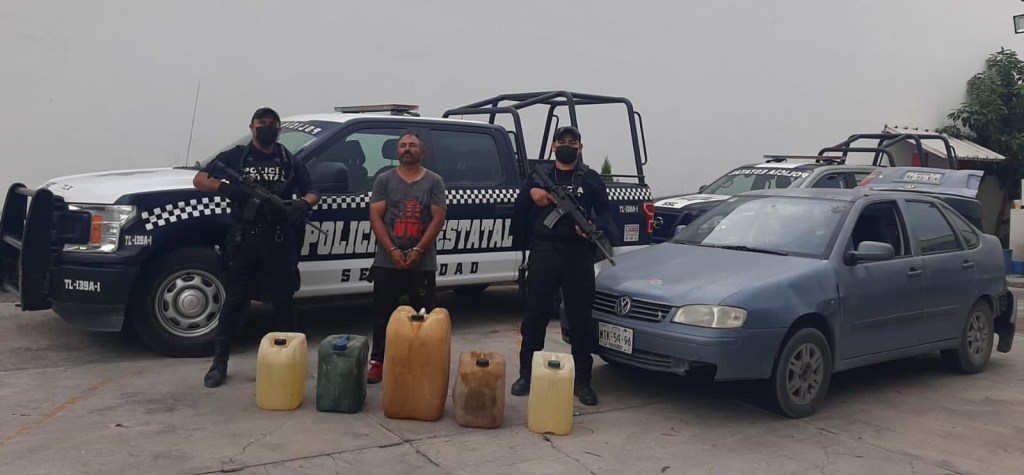 Elementos de la Secretaría de Seguridad Ciudadana (SSC) aseguraron a una persona por el delito de posesión y transporte de hidrocarburo en el municipio de Atltzayanca.