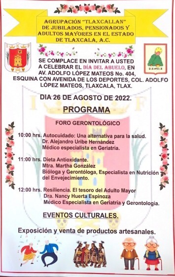 El Gobierno del Estado promueve el cuidado de los adultos mayores para garantizar su salud física y emocional, por lo que en el marco del Día del Abuelo, que se celebra el 28 de agosto, en coordinación con la agrupación “Tlaxcallan” de Jubilados, Pensionados y Adultos Mayores en el Estado de Tlaxcala, realizará el Foro Gerontológico.