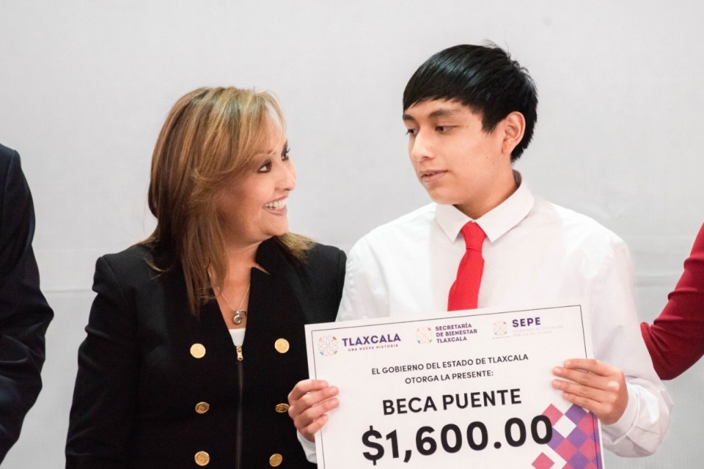 La gobernadora de Tlaxcala, Lorena Cuéllar Cisneros, entregó simbólicamente cheques por mil 600 pesos del programa “Beca Puente”, que beneficiará a 7 mil 187 estudiantes de diferentes municipios de la entidad, con una inversión de cerca de 12 millones de pesos, para evitar la deserción escolar en el proceso de transición de educación secundaria a bachillerato.