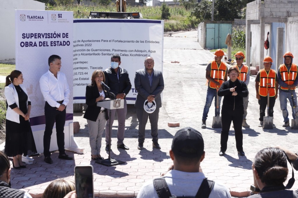 La gobernadora Lorena Cuéllar Cisneros visitó el municipio de Tzompantepec para supervisar el avance de la obra de pavimentación con adoquín en las calles Xicohténcatl y Allende del barrio de Guadalupe, así como la instalación de servicios básicos.