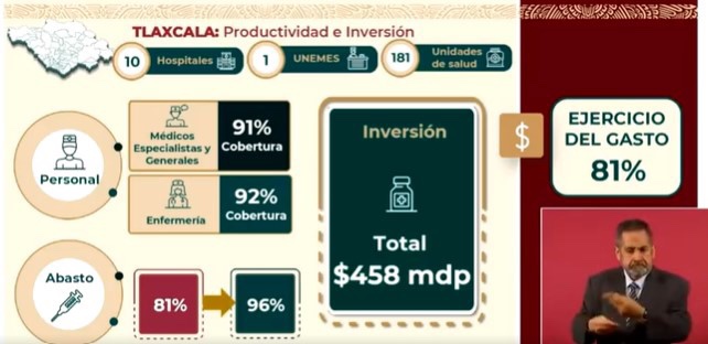 Para la implementación del sistema de salud IMSS-Bienestar en Tlaxcala se han invertido 458 millones de pesos, de los cuales 296 millones de pesos corresponden a equipo médico y 162 millones de pesos se destinan a la rehabilitación de la infraestructura, para lograr un avance del gasto de 81 por ciento en la entidad.