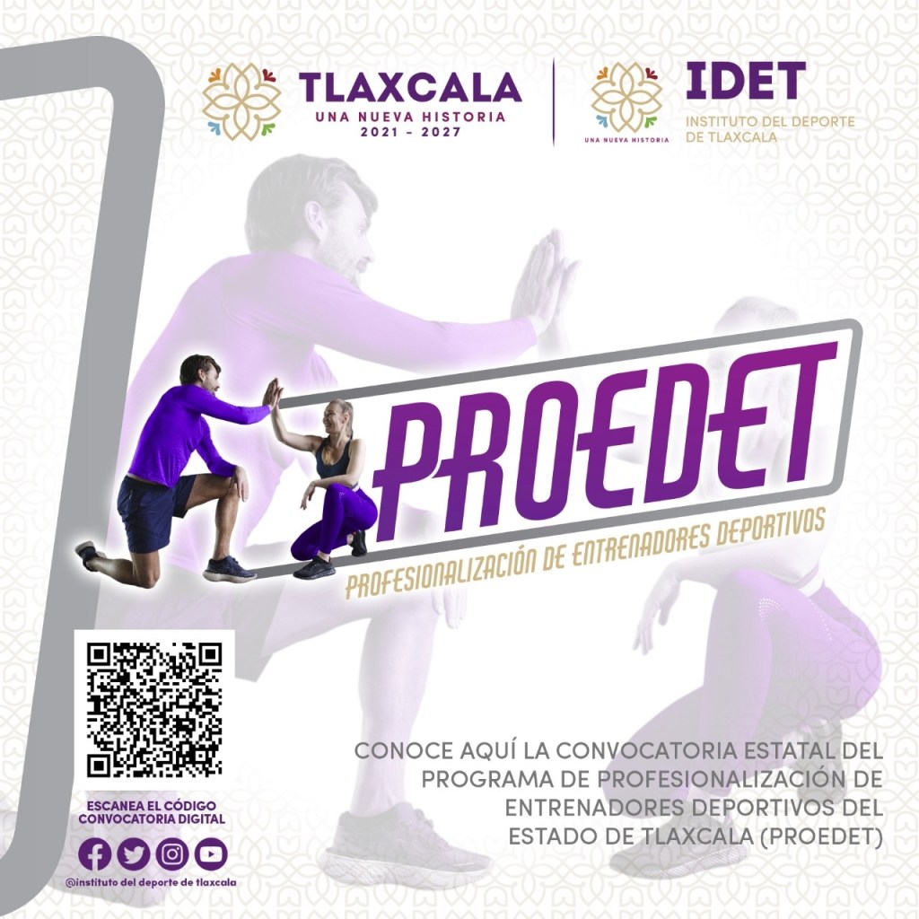 El gobierno del estado, a través del Instituto del Deporte de Tlaxcala (IDET), invita a participar en el Programa de Profesionalización de Entrenadores Deportivos del Estado de Tlaxcala (Proedet), el cual tiene como finalidad buscar la profesionalización, capacitación o actualización en esta área.
