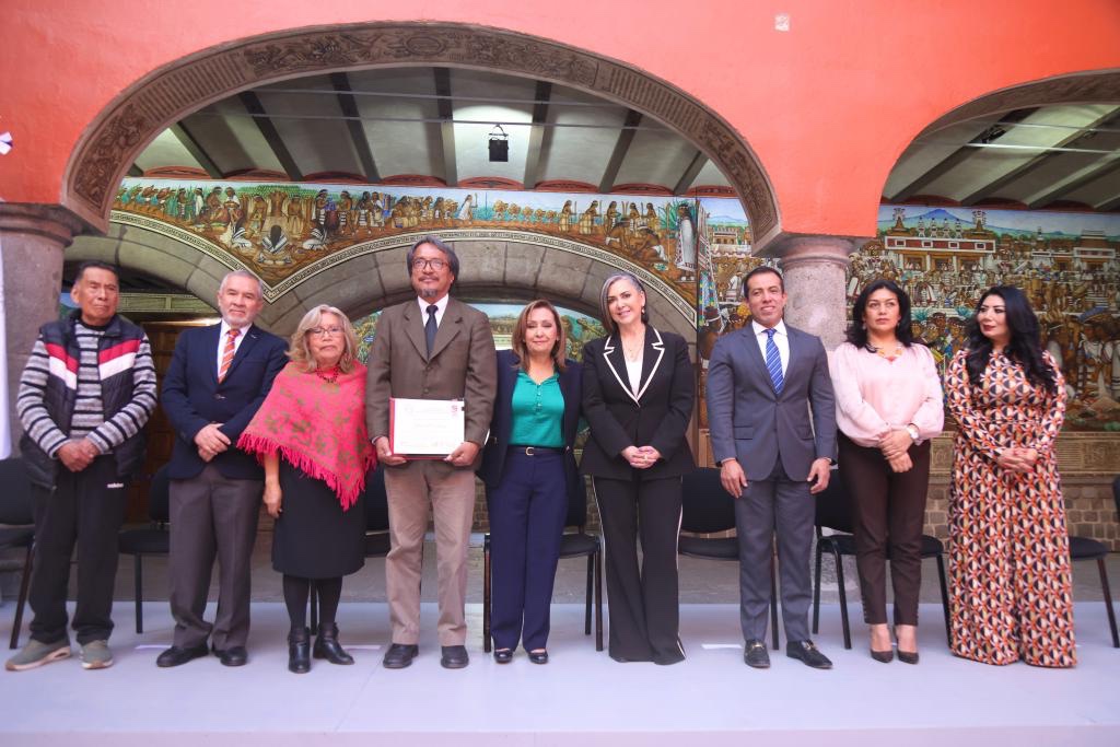 La gobernadora Lorena Cuéllar Cisneros atestiguó la entrega de la “Presea del Centenario del Nacimiento de Tlacuilo–Tlamatini Desiderio Hernández Xochitiotzin 2022–2023”, otorgada al profesor Isaías Bello Pérez por su contribución en el rescate, difusión y conservación de las tradiciones populares y la identidad tlaxcalteca.