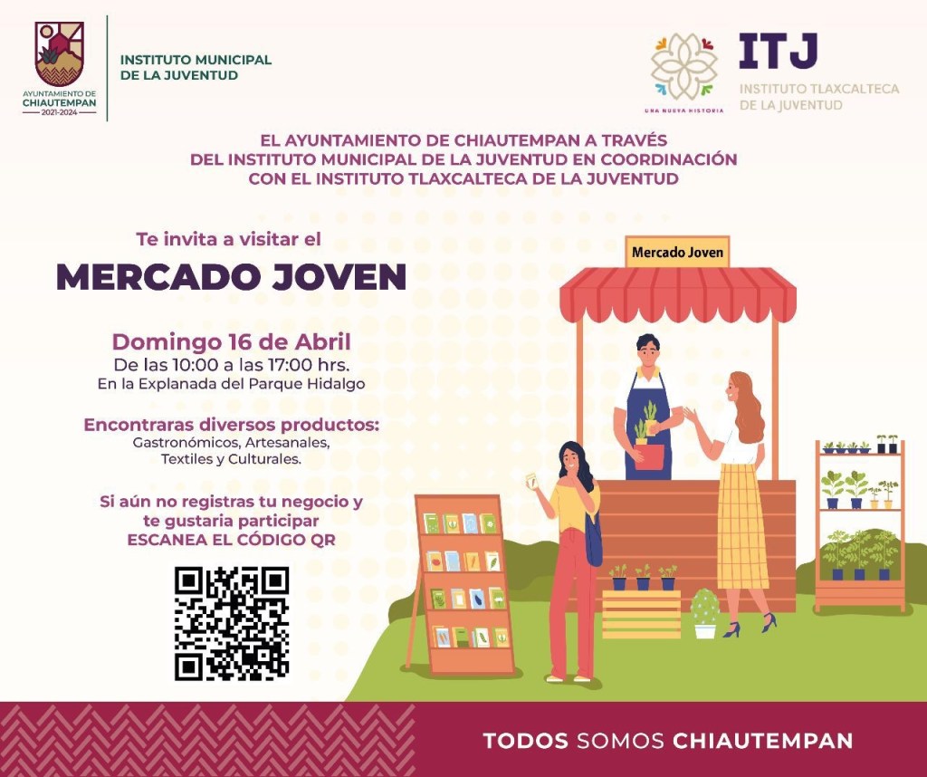 El Ayuntamiento de Chiautempan, a través del Sistema Municipal DIF (SMDIF) y en coordinación con el Instituto Tlaxcalteca de la Juventud (ITJ), invitan a la población chiautempense a acudir al «Mercado Joven» que se instalará en el municipio el próximo domingo 16 de abril.