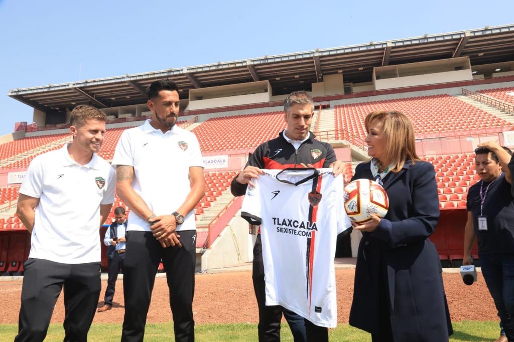 La titular del Ejecutivo local, Lorena Cuéllar Cisneros sostuvo un encuentro con integrantes del equipo de fútbol “Club Coyotes” de Tlaxcala, en las instalaciones del estadio Tlahuicole, donde estuvieron directivos y jugadores, a quienes reconoció los resultados alcanzados al momento.