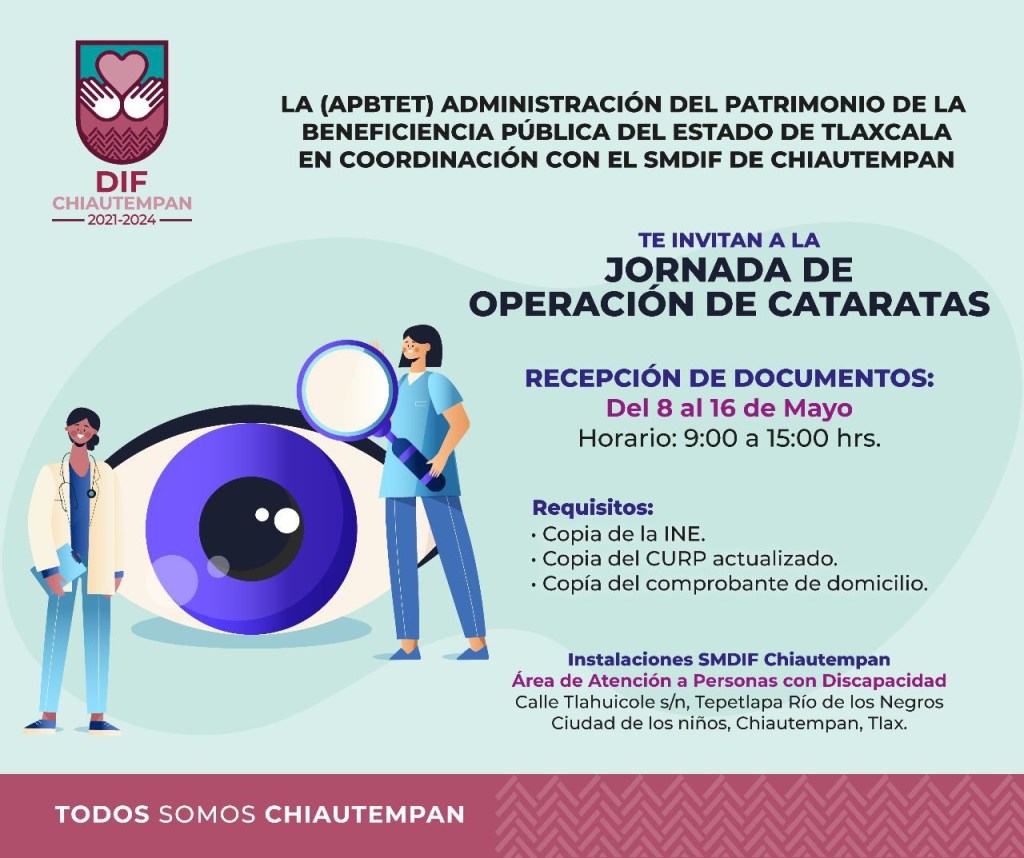 El Ayuntamiento de Chiautempan a través del Sistema Municipal para el Desarrollo Integral de la Familia (SMDIF) y en coordinación con la Administración del Patrimonio de la Beneficencia Pública del Estado de Tlaxcala (APBTET), invitan a la población chiautempense a la Jornada de operación de cataratas gratuita.