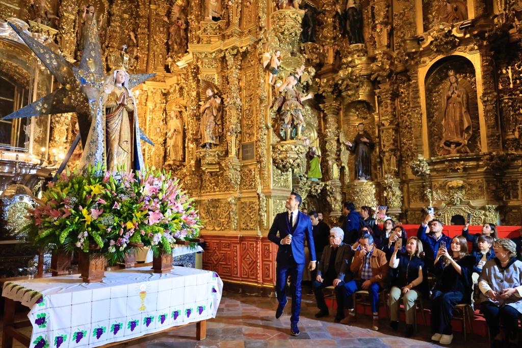 La titular del Ejecutivo local y el cantautor saludaron y se tomaron fotografías con las y los fieles católicos, que con ansias esperaban la salida de la Virgen de la Basílica de Ocotlán para acompañarla en su recorrido por las principales calles de la ciudad capital.