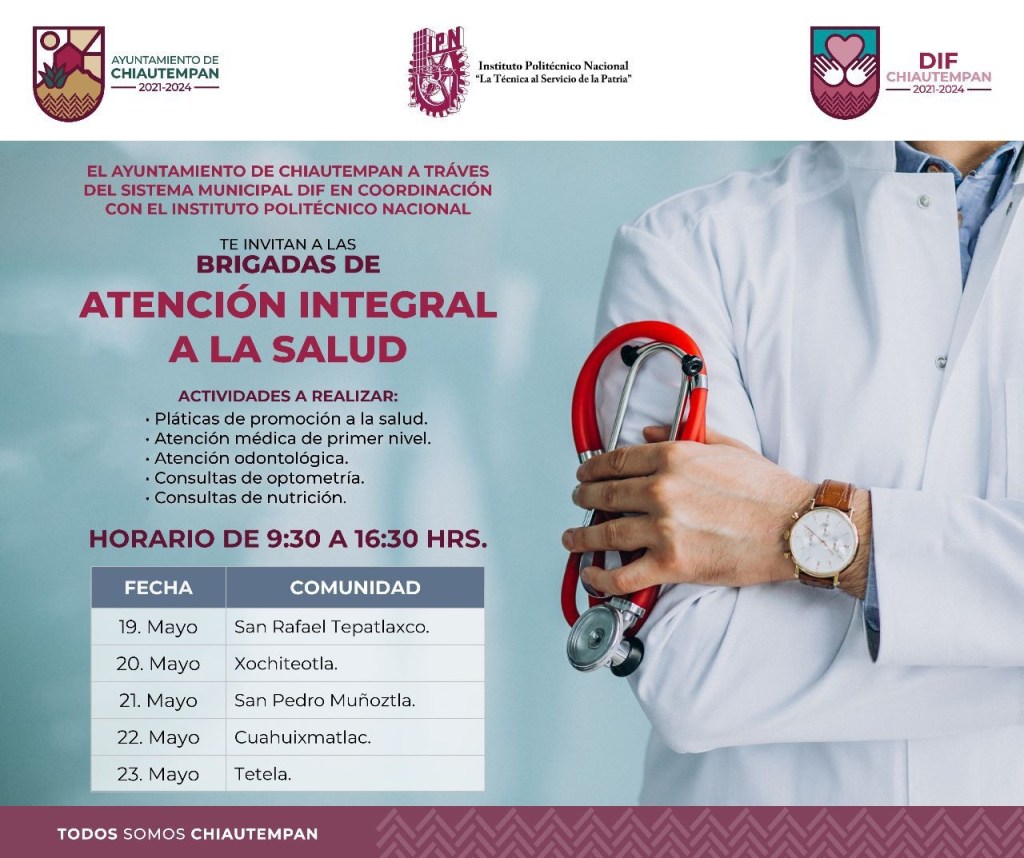 El Ayuntamiento de Chiautempan a través del Sistema Municipal para el Desarrollo Integral de la Familia (SMDIF), invita a la población chiautempense a aprovechar los servicios médicos que ofrecerán las Brigadas de atención integral a la salud del Instituto Politécnico Nacional (IPN).