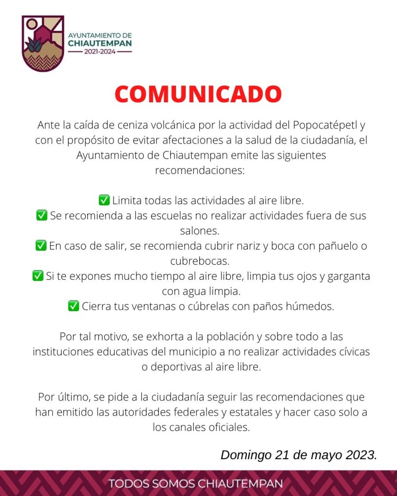 Ante la caída de ceniza volcánica por la actividad del Popocatépetl y con el propósito de evitar afectaciones a la salud de la ciudadanía, el Ayuntamiento de Chiautempan emite las siguientes recomendaciones: