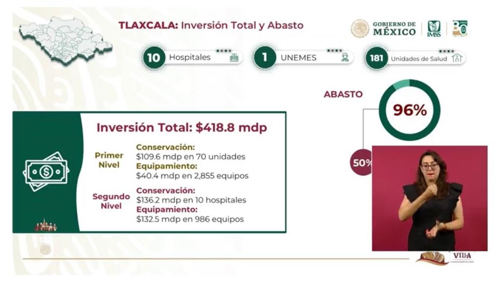El director general del Instituto Mexicano del Seguro Social (IMSS), Zoé Robledo Aburto informó que en Tlaxcala se han invertido 418.8 millones de pesos en 10 hospitales y 70 Centros de Salud para la rehabilitación y adquisición de equipo médico, con la finalidad de elevar la atención médica y garantizar el acceso a los servicios de salud a la población sin seguridad social.