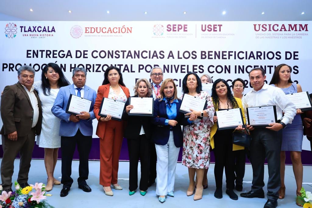 Durante el acto protocolario, la mandataria destacó que Tlaxcala es el único estado del país que aporta recursos económicos para la promoción de docentes, a través de la Unidad del Sistema para la Carrera de las Maestras y Maestros (Usicamm)