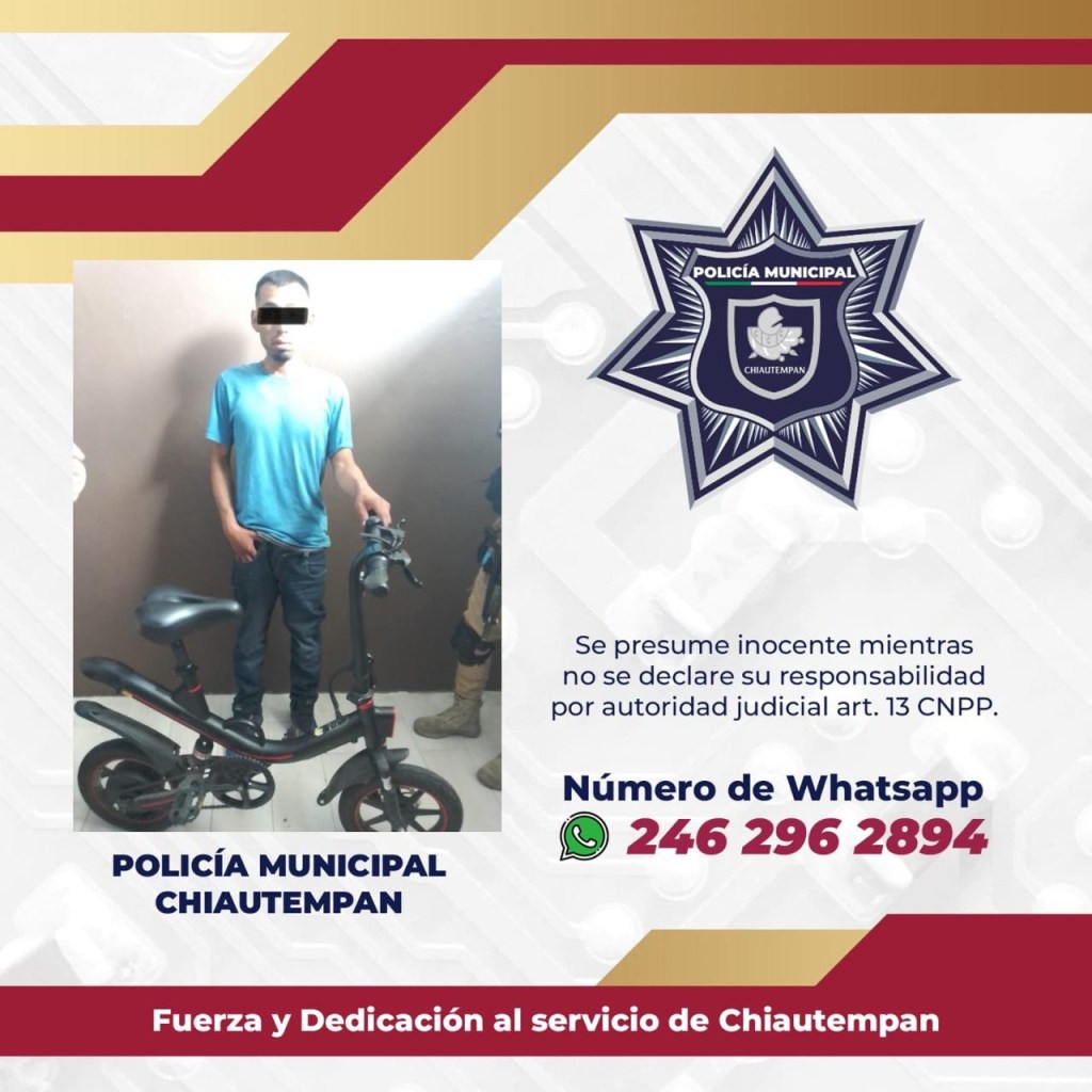 Elementos del Grupo de Operaciones Tácticas (GOT) de la Dirección de Seguridad Pública Vialidad y Protección Civil de Chiautempan, detuvieron a un hombre al ser señalado por intentar hurtar una bicicleta eléctrica.
