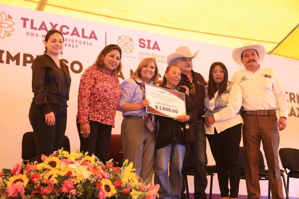 De manos de la gobernadora recibieron llaves de tractor, Moisés Maza Pérez, de Hueyotlipan; equipo para extracción de miel, Agustín García Rojas, de Tetlatlahuca; 15 vientres de ovino, Engracia Barrios Sarmiento, de Terrenate; sistema fotovoltaico autónomo, Rosa Inocencia Chávez López, de Huamantla; sistema de riego, Cruz Loaiza Leal, de Atltzayanca; y cheque por siniestros a cultivos, Delfina Mendoza Lazcano, de Xaltocan.