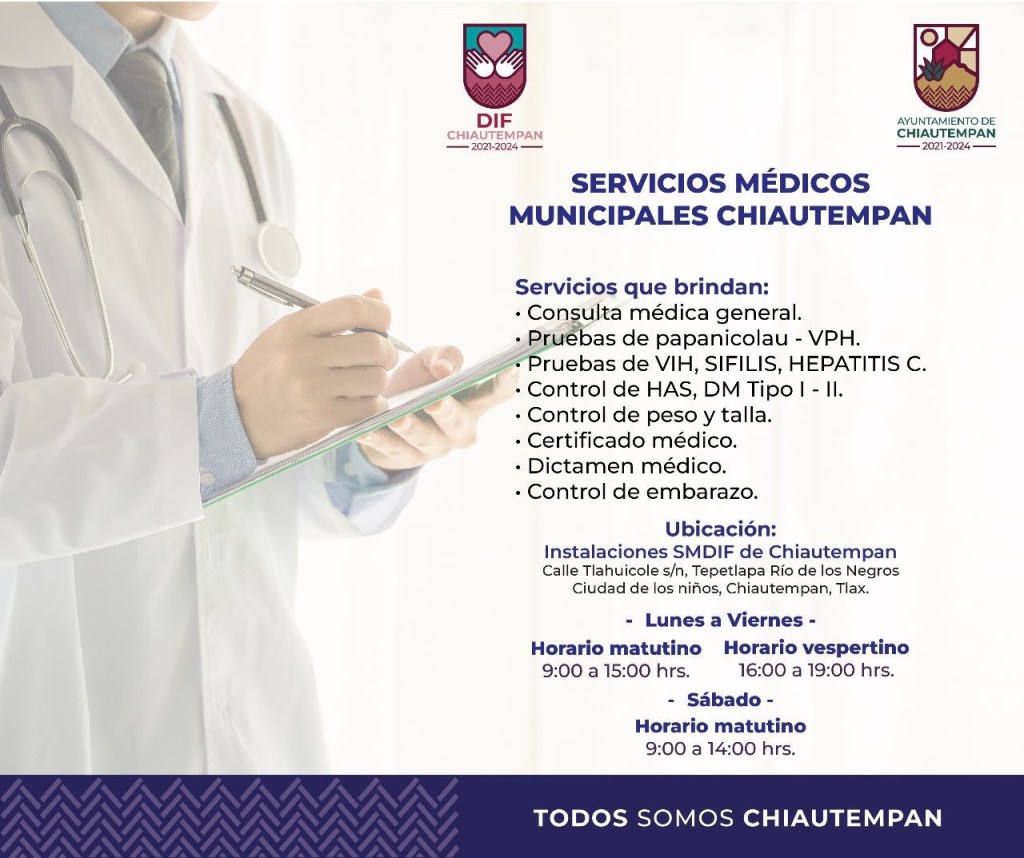 Entre los servicios que ofrece el SMDIF, se encuentra la consulta médica general, pruebas de Papanicolau – VPH, VIH, Sífilis, Hepatitis, Control de HAS, DM Tipo I – II, peso y talla, certificado y dictamen médico, además de control de embarazo.
