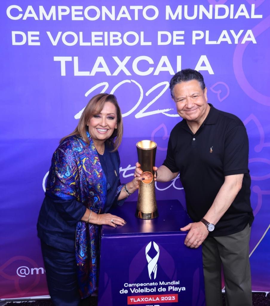 La gobernadora de Tlaxcala, Lorena Cuéllar Cisneros y su homólogo de Hidalgo, Julio Menchaca Salazar, develaron el trofeo que será entregado a los finalistas del Mundial de Voleibol de Playa Tlaxcala 2023, a realizarse del 5 al 15 de octubre.