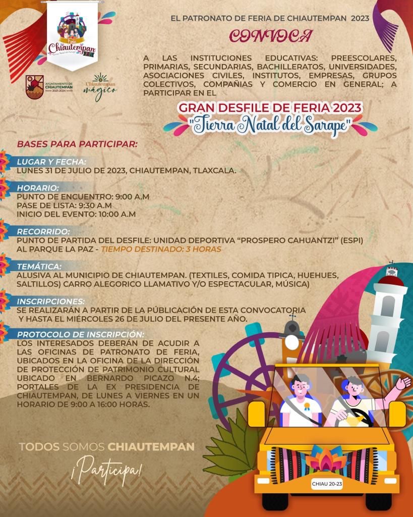 El Ayuntamiento de Chiautempan, invita a instituciones educativas de los diferentes niveles, negocios, asociaciones civiles, empresas y grupos en general a participar en el Gran Desfile de Feria 2023, que se realizará el 31 de julio del presente.