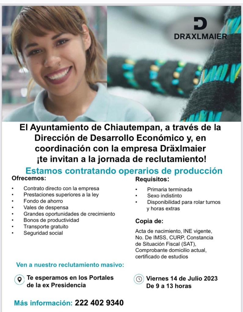 El Ayuntamiento de Chiautempan a través de la Dirección de Desarrollo Económico y en coordinación con la empresa Dräxlmaier, convoca a la población en general, a la jornada de reclutamiento de operarios de producción el próximo viernes 14 de julio.