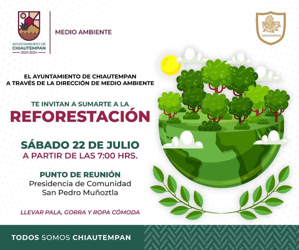 El Ayuntamiento de Chiautempan a través de la Dirección de Medio Ambiente, invita a la población en general a sumarse a la campaña de reforestación programada para este sábado 22 de julio.