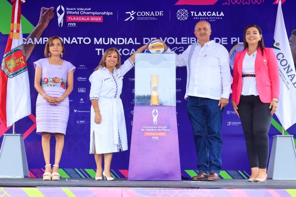 La gobernadora Lorena Cuéllar Cisneros y su homólogo de Tabasco, Carlos Manuel Merino Campos, develaron en la Plaza de Armas de la ciudad de Villahermosa el trofeo que será entregado a los finalistas del Mundial de Voleibol de Playa Tlaxcala 2023, a realizarse del 5 al 15 de octubre.