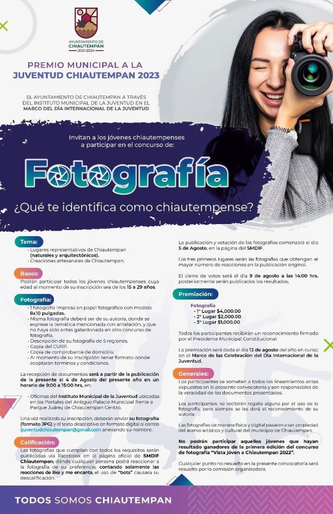 El Ayuntamiento de Chiautempan a través del Instituto Municipal de la Juventud (IMJ), invita a las y los jóvenes del municipio a participar en el concurso de fotografía ¿Qué te identifica como chiautempense? organizado en el marco del mes de la juventud.