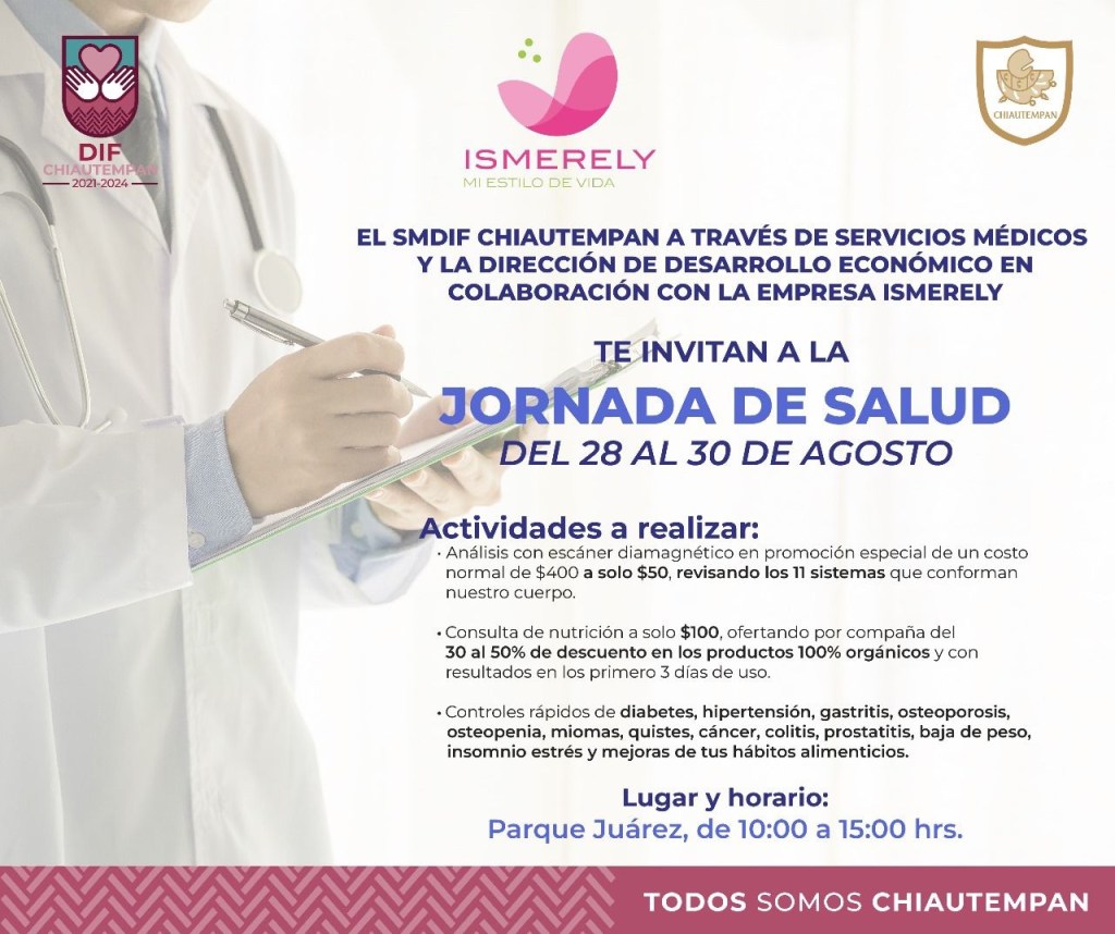El Ayuntamiento de Chiautempan a través del Sistema Municipal para el Desarrollo Integral de la Familia (SMDIF) en conjunto con la Dirección de Desarrollo Económico y en coordinación con la empresa Ismerely, invitan a la ciudadanía a la Jornada de Salud, del 28 al 30 de agosto.
