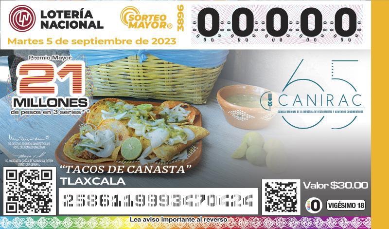 La imagen de los Tacos de Canasta, platillo típico del estado Tlaxcala, aparecerá impresa en los boletos del sorteo No. 3900 de la Lotería Nacional (Lotenal), como parte de las celebraciones por el 65 aniversario de la Cámara Nacional de la Industria de Restaurantes y Alimentados Condimentados (Canirac).