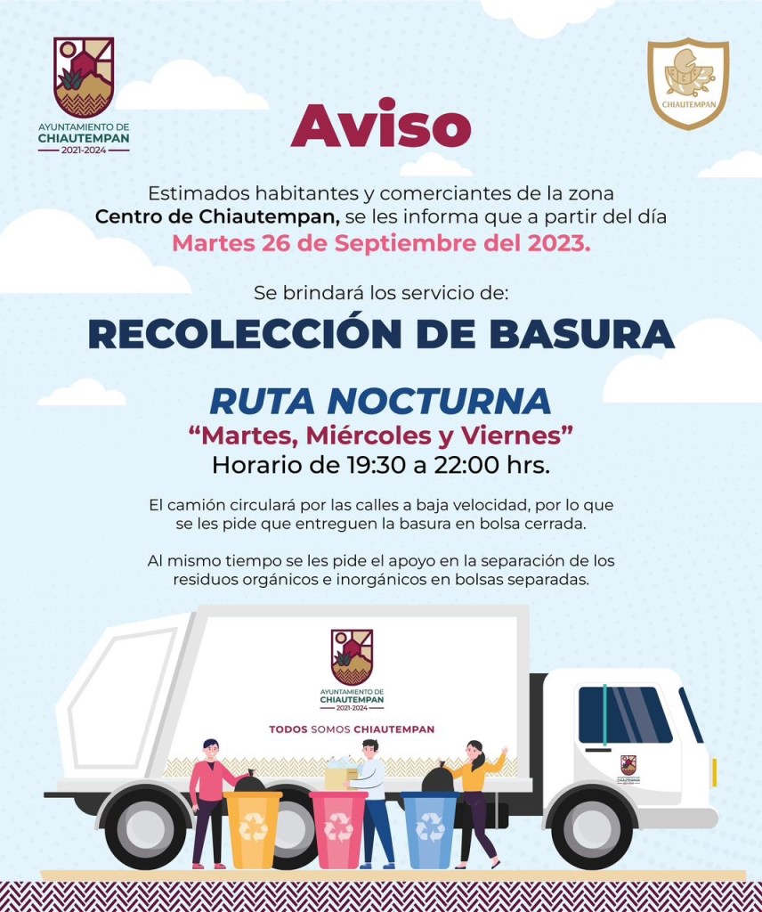 La Dirección de Servicios Públicos Municipales del Ayuntamiento de Chiautempan, informa que el camión recolector de basura recorrerá las calles de la zona centro en un horario modificado con base a las necesidades de vecinos y locatarios.