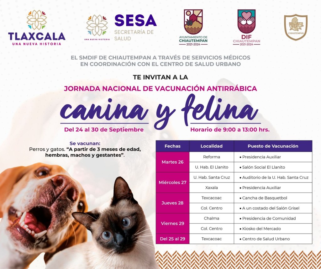 El Ayuntamiento de Chiautempan a través del Sistema Municipal para el Desarrollo Integral de la Familia (SMDIF), de Servicios Médicos Municipales y en coordinación con el Centro de salud urbano, invita a la población a la Jornada nacional de vacunación antirrábica canina y felina del 24 al 30 de septiembre.