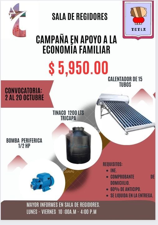 El Presidente Municipal de Tetla de la Solidaridad, Andrés Ramírez Galicia, en conjunto con regidores, traen en beneficio de los tetlenses, la Campaña en Apoyo a la Economía Familiar, en esta primera etapa, el paquete constará de una bomba de ½ hp, un tinaco de 1,200 litros y un calentador solar de 15 tubos, por 5,950 pesos.