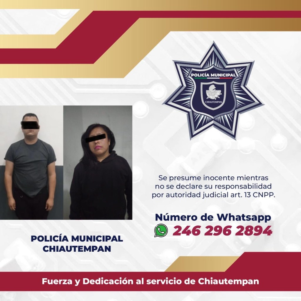 De este modo, la Dirección Municipal cumplió con la detención de Manuel N., de 28 años de edad y Adriana N., de 25 años de edad, ambos originarios del Estado de México.