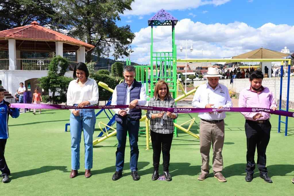 Con una inversión de 2 millones 2 mil 187.82 de pesos, la gobernadora Lorena Cuéllar Cisneros entregó la construcción de una cancha de usos múltiples en la comunidad de Zacatonal, además de un gimnasio al aire libre, juegos infantiles y rehabilitación del parque en la localidad de Acopinalco del Peñón, ambas del municipio de Tlaxco.