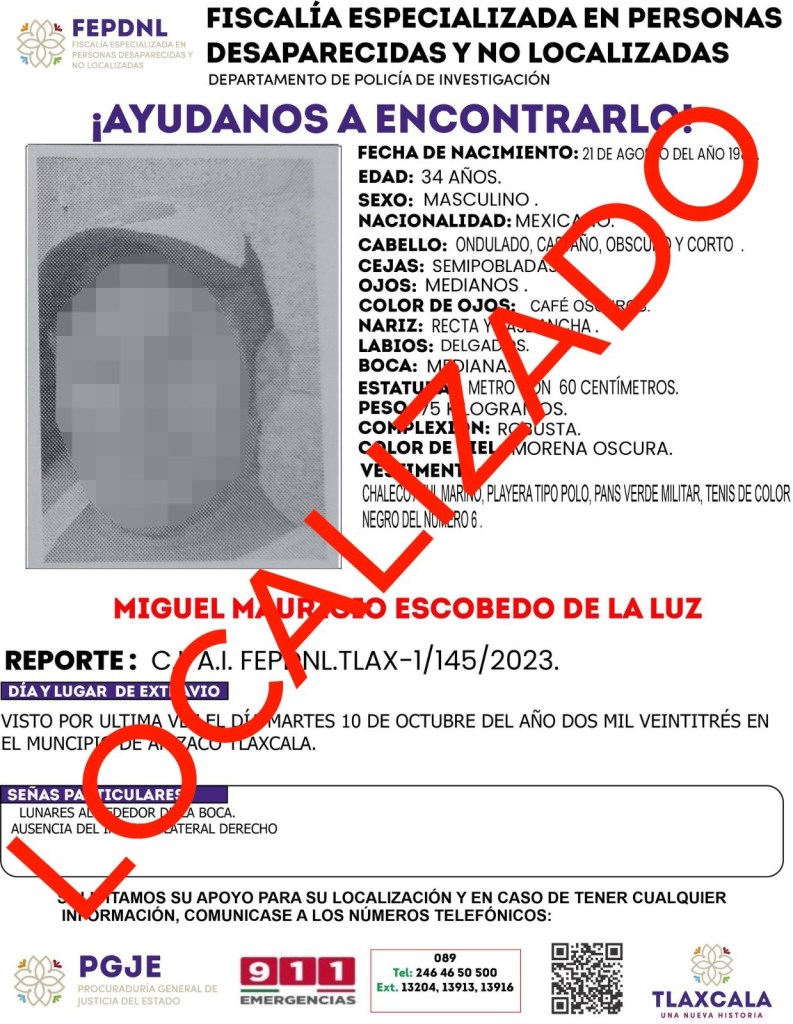 Además se identificó al masculino, quien en vida respondía al nombre de Miguel N., de 34 años y quien contaba con una ficha de búsqueda, ya que fue visto por última vez en el municipio de Apizaco el día martes 10 de octubre. El cuerpo ya fue entregado a sus familiares